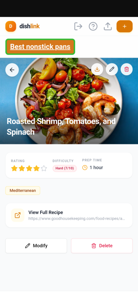 DISH LINK does not store recipes, it stores key pieces of information about recipes found on the web and you can quickly load the recipe. DISH LINK stores links, pictures, ratings, times, and tags of your favorite recipes.